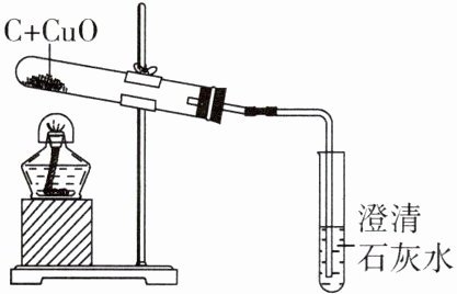 3. 把烘干的木炭粉末和氧化铜粉末混合均匀,小心地铺放进试管,并把试管固定在铁架台上,将导管插入澄清石灰水中(如图)。用酒精灯给混合物充分加热,使其充分反应。