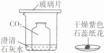 先将干燥紫色石蕊纸花放入盛有二氧化碳的集气瓶中,纸花不变色,将纸花取出喷水后再放入盛有二氧化碳的集气瓶中,纸花变红