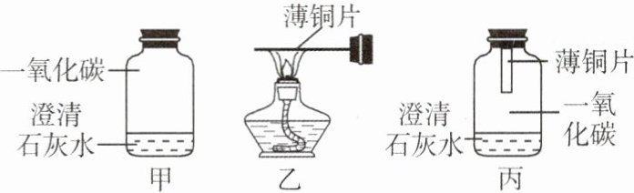 。(2)趁热将图乙所示的薄铜片插入图甲所示的装置中(如图丙所示), 观察薄铜片的颜色变化, 其现象是