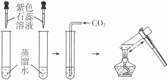 ;将通入二氧化碳的试管放在酒精灯火焰上加热,观察到溶液由红色变成紫色