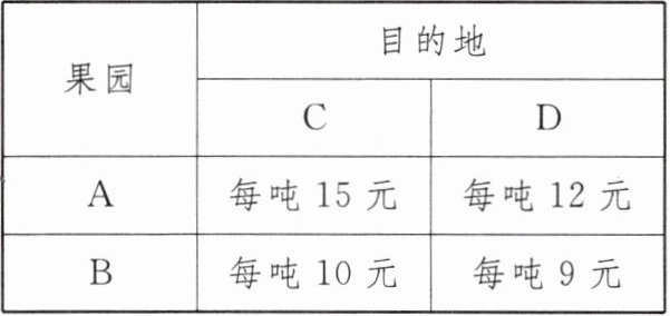 19. (11分)$A$,$B$两果园分别有苹果30吨和20吨,$C$,$D$两城市分别需要苹果35吨和15吨.已知从$A$,$B$两果园到$C$,$D$两城市的运费如下表: