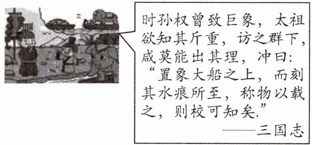 18. 新考向 传统文化(河北中考)“曹冲称象” 是流传很广的故事. 如图,按照他的方法:先将象牵到大船上,并在船侧面标记水位,再将象牵出,然后往船上抬入 20 块等重的条形石,并在船上留 3 个搬运工,这时水位恰好到达标记位置. 如果再抬入 1 块同样的条形石,船上只留 1 个搬运工,水位也恰好到达标记位置. 已知搬运工体重均为 120 斤,设每块条形石的重量是 $ x $ 斤,则正确的是(
