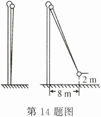 14. 如图,小亮将升旗的绳子拉到旗杆底端,绳子末端刚好接触到地面.然后将绳子末端拉到距离旗杆 8 m 处,发现此时绳子末端距离地面 2 m,则旗杆高度为(滑轮上方的部分忽略不计)