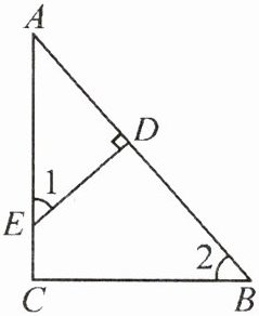 9. 如图,E是△ABC中边AC上的一点,过点E作ED⊥AB,垂足为D.若∠1=∠2,则△ABC是直角三角形吗?为什么?
