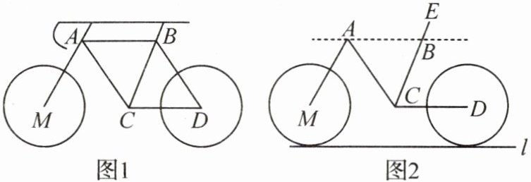 6. 新考向 真实情境(青岛即墨区期末)如图1,将某品牌共享单车放在水平地面上,图2是其示意图,其中$AB$,$CD$都与地面$l$平行,$∠BCD=68^{\circ}$,$∠BAC=57^{\circ}$,$AM$与$CB$平行,则$∠MAC$的度数为
