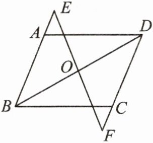 13. 如图,已知 $ AD = BC $,$ AB = CD $,$ O $ 是 $ BD $ 中点,过点 $ O $ 作直线交 $ BA $ 的延长线于点 $ E $,交 $ DC $ 的延长线于点 $ F $。求证:$ OE = OF $。