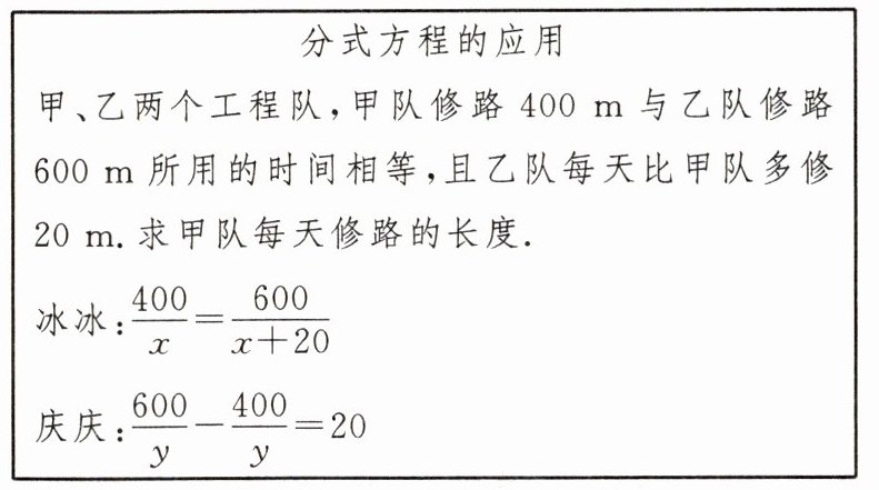(2)冰冰同学所列方程的等量关系:甲队修路400m所用的时间=乙队修路600m所用的时间;庆庆同学所列方程的等量关系:乙队每天修路的长度-甲队每天修路的长度=20m.