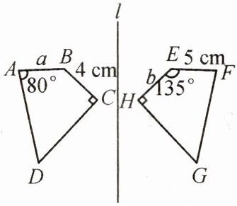 3.解:因为两个四边形关于直线l对称,所以四边形ABCD≌四边形FEHG.所以∠H=∠C=90°,∠A=∠F=80°,∠E=∠B=135°,AB=EF,BC=EH.所以∠G=360°-∠H-∠E-∠F=55°,a=5cm,b=4cm.