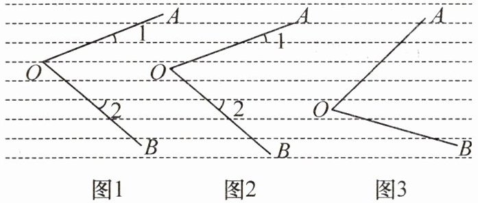 (1)①40° ②∠1+∠2=60°. 理由:作OP平行于格线. 因为格线互相平行,所以∠1=∠AOP,∠2=∠BOP. 因为∠AOB=∠AOP+∠BOP=60°,所以∠1+∠2=60°.