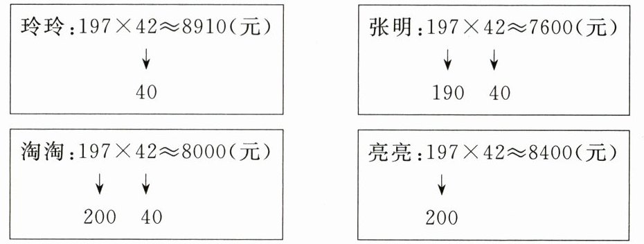 9. 某单位假期组织42人去户外团建,每人的费用是197元,要解决“团队需要准备多少元”这样一个问题,估算方法最合适的是( )