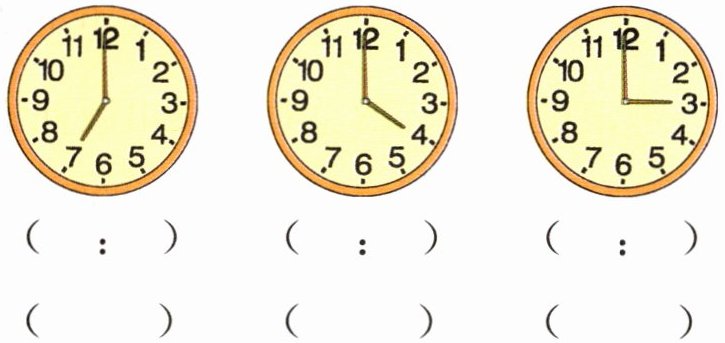 7. 先写出下面每个钟面上的时间,再量一量钟面上的分针和时针所组成的角的度数。