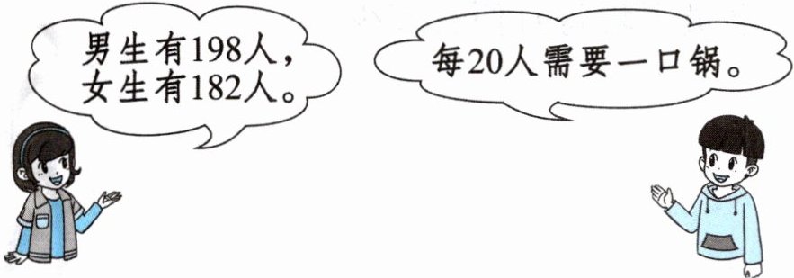 4. 幸福小学四年级的同学举行野营活动。请你替他们安排一下,一共需要多少口锅?