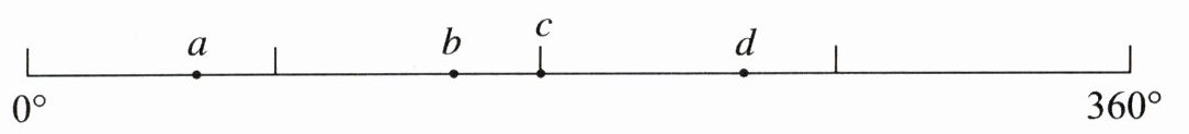 8. 用下面线段上的点表示从$0^{\circ}到360^{\circ}$。关于$a$、$b$、$c$、$d$这四个角,下面说法正确的是( )