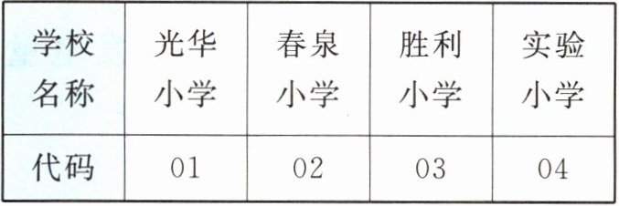 解析:本题可根据所给学校代码表以及学号需体现的信息(学校、入学时间、班级、性别和座号)来为学生编号。通常可设定编码规则,例如:前两位为学校代码,第三 - 六位为入学年份,第七位为年级,第八位为班级,第九位为性别(可设定男为 1,女为 2 ),第十 - 十一位为座号。