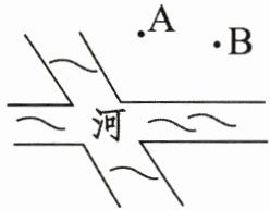 24. 如图,点A和点B分别代表小明家和小刚家。画出他们两家之间的最短距离。现在要从小明家铺一条小路,以便到河边取水,怎么样取可以使路线最短?把最短的路线画出来。
