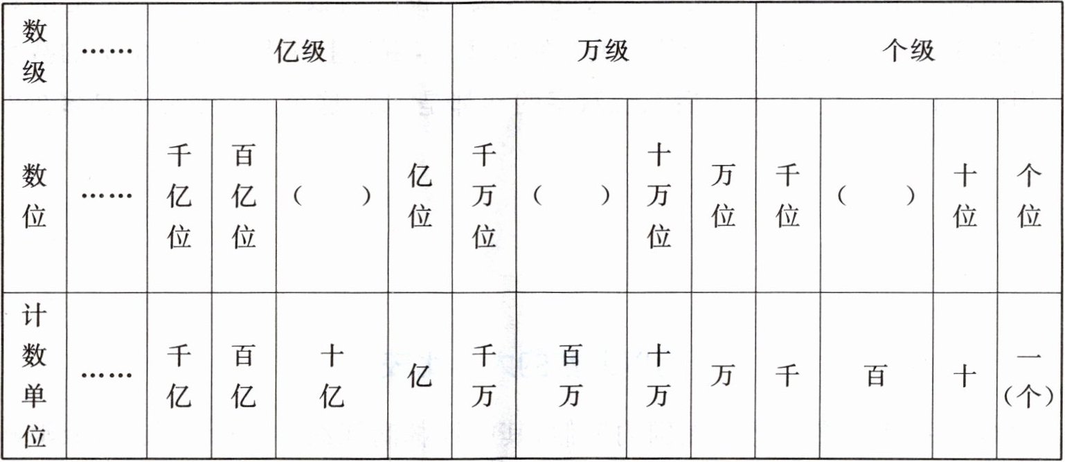 |数位|……|千亿位|百亿位|( )|亿位|千万位|( )|十万位|万位|千位|( )|十位|个位|