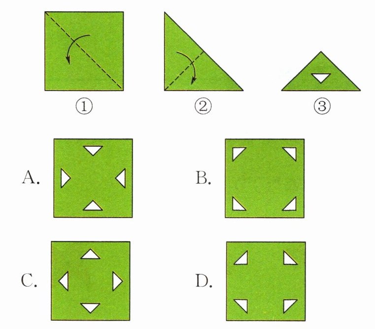 5. 把一张正方形纸片如图①、图②对折两次后,再如图③挖去一个三角形小孔,则展开后图形是(