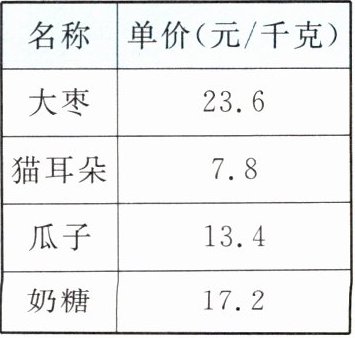 (3)买5千克猫耳朵和1个魔方,一共要花多少钱?