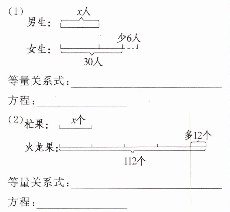 (1)男生人数×2-少的人数=女生人数 2x-6=30