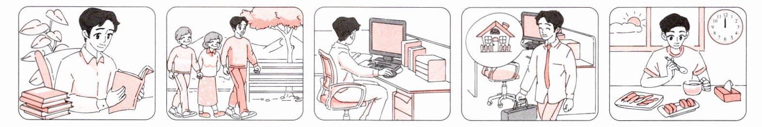 李瑶想为家人们制作日程表,她正询问爸爸的日常活动。听录音,用数字给图片排序。