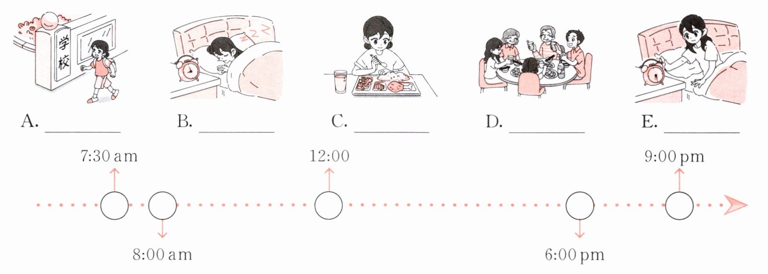 三、李瑶开始制作手账,她为自己的日常生活设计了一条时间轴。根据图片提示在横线上填写恰当的短语,并将图片序号填到时间轴上的相应圆圈内。