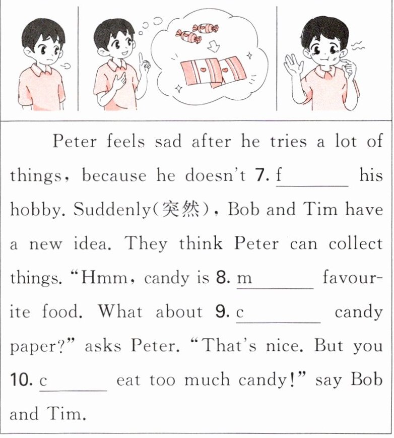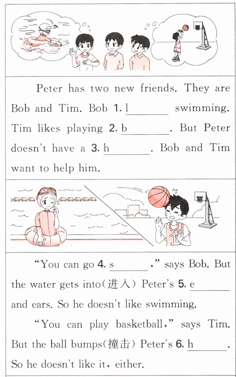 五、【绘本阅读】根据图片及首字母提示,补全绘本。