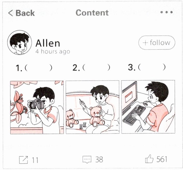 三、Allen 在微博上记录了自己的爱好。请根据微博图片,选择合适的描述。