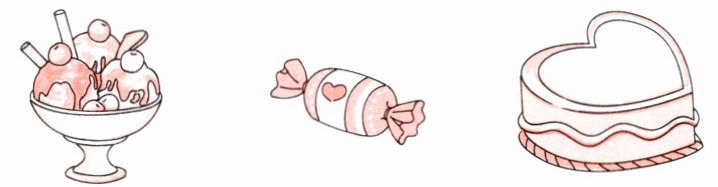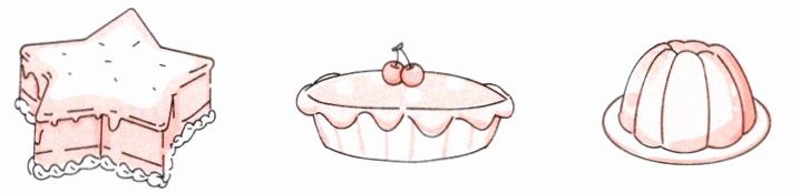 1. ice cream 2. candy 3. heart-shaped cake 4. star-shaped cake 5. fruit pie 6. jelly