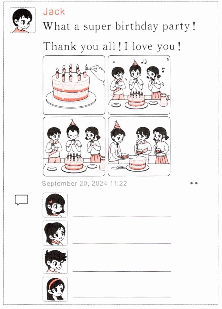 四、Jack 在朋友圈中晒出了自己的生日照片。请根据照片选择恰当的评论,将选项填在横线上。(有一个多余选项)