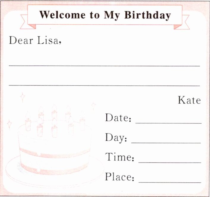 六、Kate要过生日了,她准备邀请朋友参加她的生日派对,请根据以下内容设计一张邀请卡。