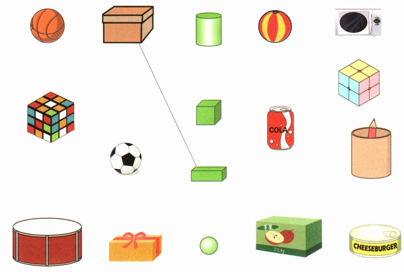 (此处需根据实际插图中立体图形位置对应连线,文本无法直接呈现连线,实际作答时在图上完成球体、正方体、长方体、圆柱体与对应物体的连线)