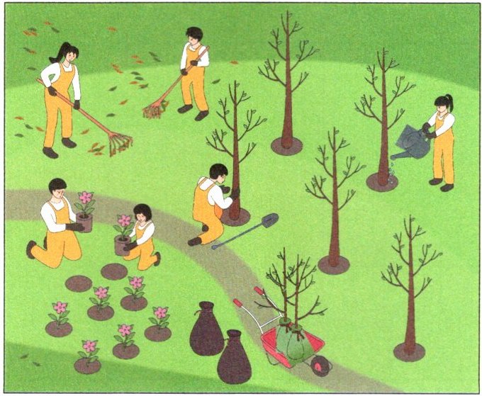 1. 信息:有3组人在种树,一组2人在种盆栽,一组2人在用耙子和扫帚清理,一组2人在用铲子和水壶种树,地面上有5棵已种的树,3个花盆已种花,还有3个空花盆,2个黑色大袋子,1辆手推车。