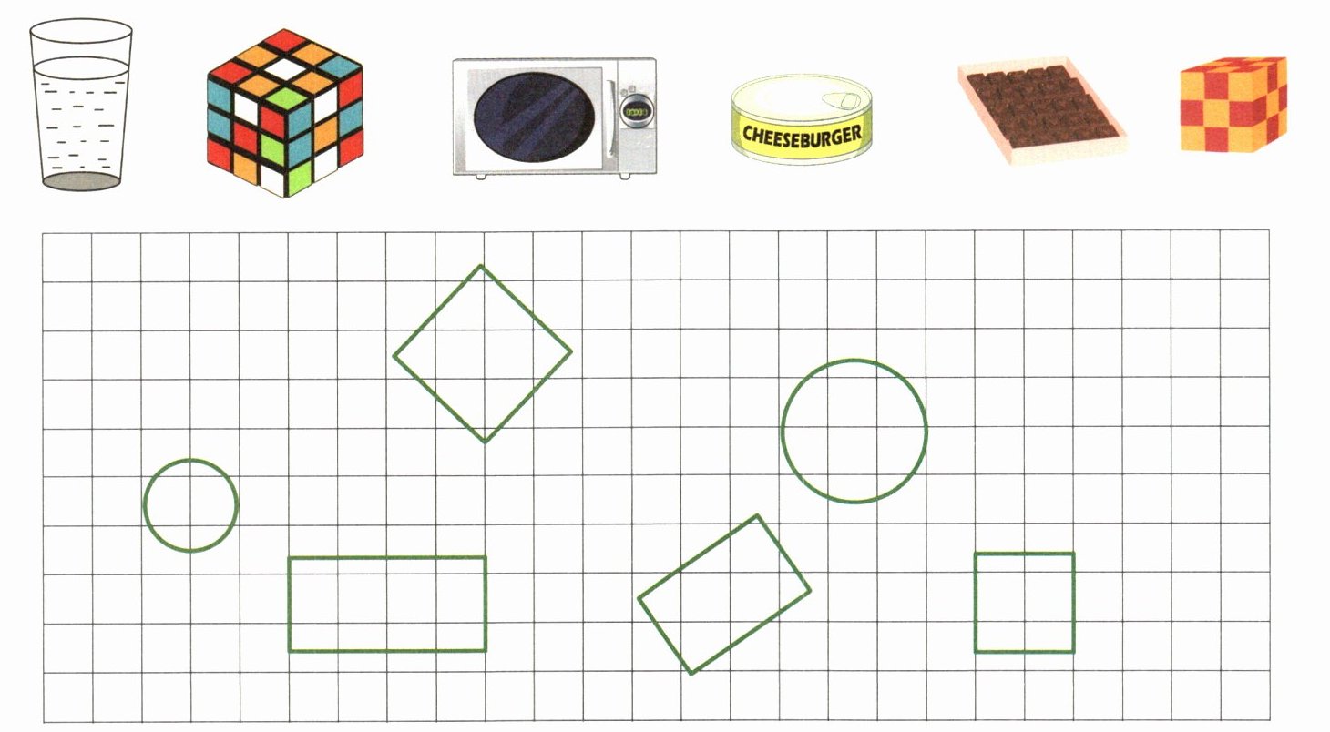 2. 格子图中的平面图形是从哪个物品上描下来的,请连一连。