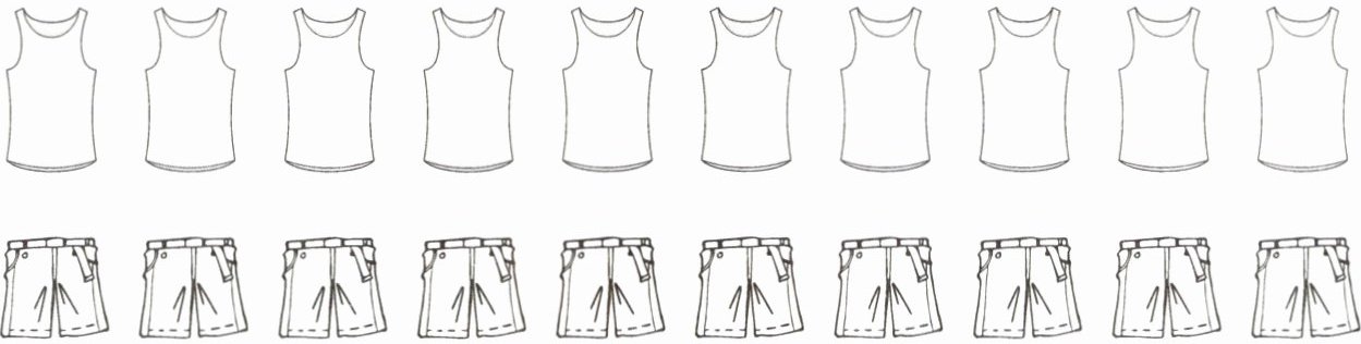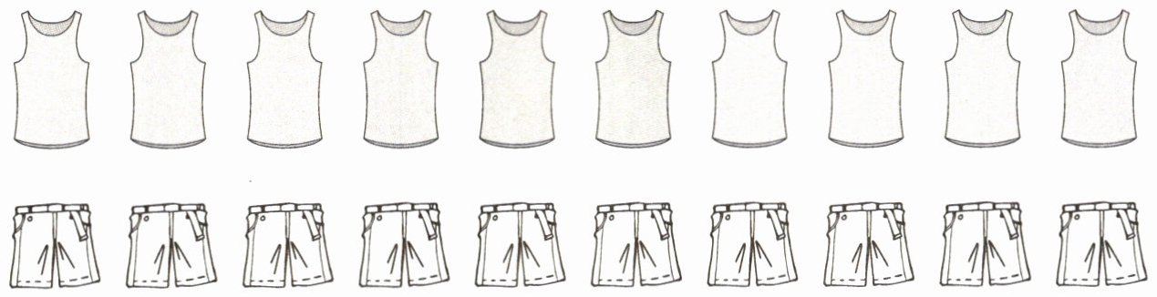方法二:把每件上衣和每条短裤看作一组圈起来(横向一组一组圈),可圈5组,表示2个5是10。