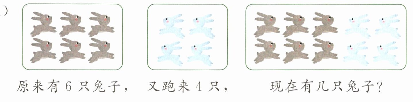 原来有 6 只兔子,又跑来 4 只,现在有几只兔子?