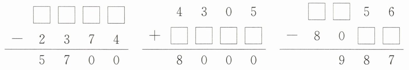 $\begin{array}{r}□□□□\\-2374\\\hline5700\end{array} $ $\begin{array}{r}4305\\+□□□□\\\hline8000\end{array} $ $\begin{array}{r}□□56\\-80□□\\\hline987\end{array} $