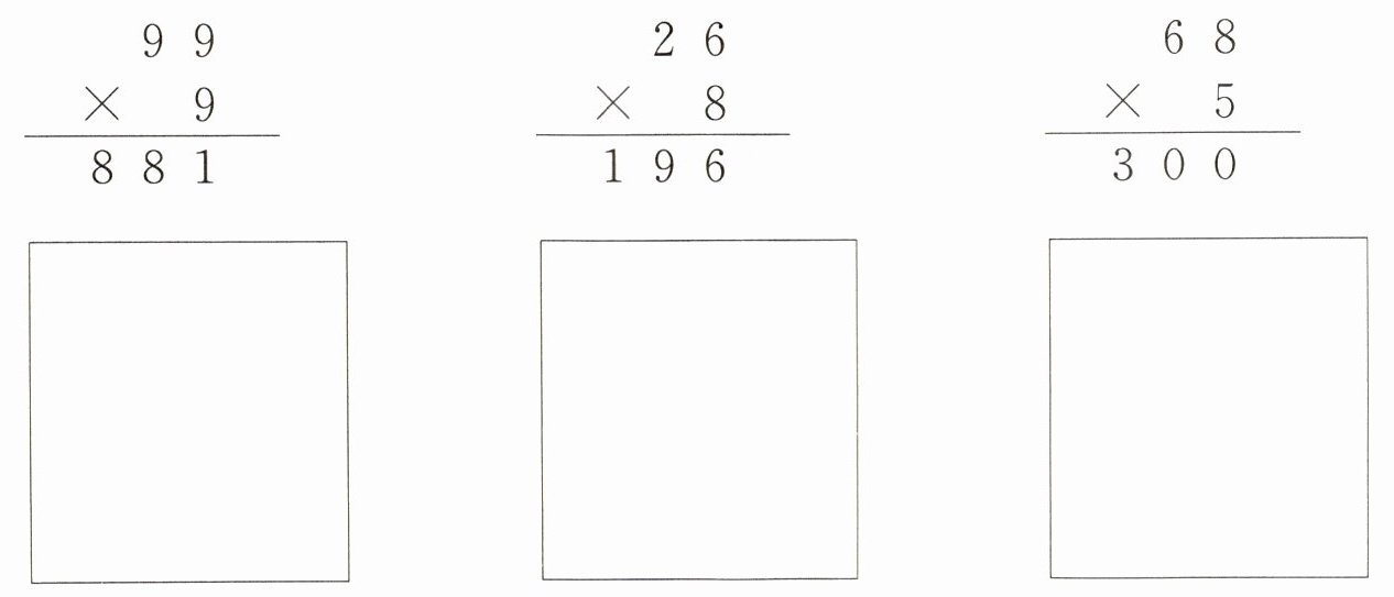 $\begin{array}{r}99\\×9\\\hline881\end{array} $ $\begin{array}{r}26\\×8\\\hline196\end{array} $ $\begin{array}{r}68\\×5\\\hline300\end{array} $