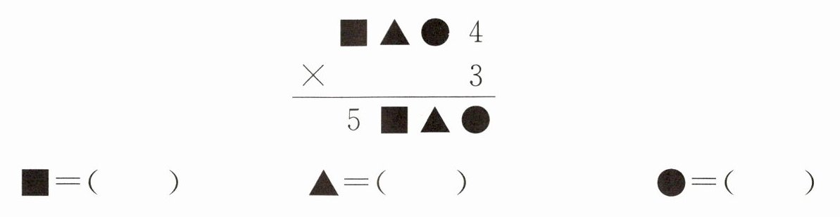 $\begin{array}{r}■\ ▲\ ●\ 4 \\×\ \ \ \ \ \ \ \ \ 3 \\\hline5\ ■\ ▲\ ●\end{array} $