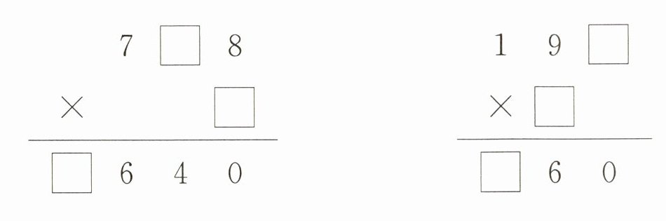 $\begin{array}{r}7□8\\×□\\\hline□640\end{array} $ $\begin{array}{r}19□\\×□\\\hline□60\end{array} $