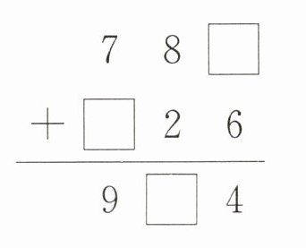 \begin{array}{r}7\quad8\quad□\\+□\quad2\quad6\\\hline9\quad□\quad4\end{array} $