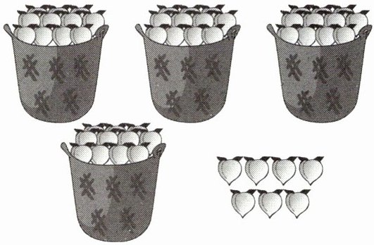 (4)如图,每个篮子里有14个桃,一共有多少个桃?把这些桃平均分给3只小猴,每只小猴分到多少个桃?