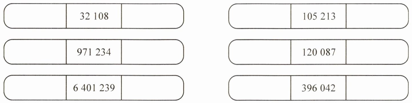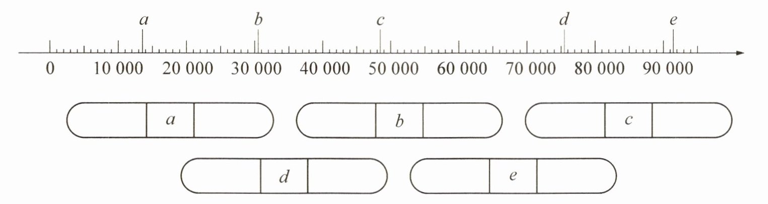 2 写出与 $ a $、$ b $、$ c $、$ d $、$ e $ 相邻的整万数,在最邻近的整万数上画“√”。