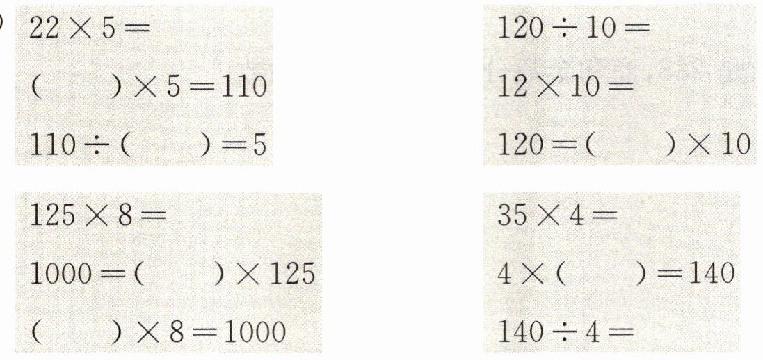 除法中的除数和商相当于乘法中的 $\begin{cases} 积( ) \\ 因数( ) \end{cases} $
