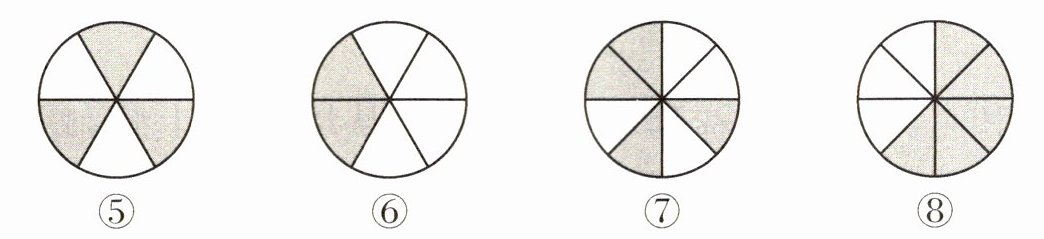 (3) 说一说:比较图①、②和⑥可以知道,同样大小的整体,平分的份数越少,每一份就( );还可以知道,比较分子相同的分数,分母( ),分数就越大。