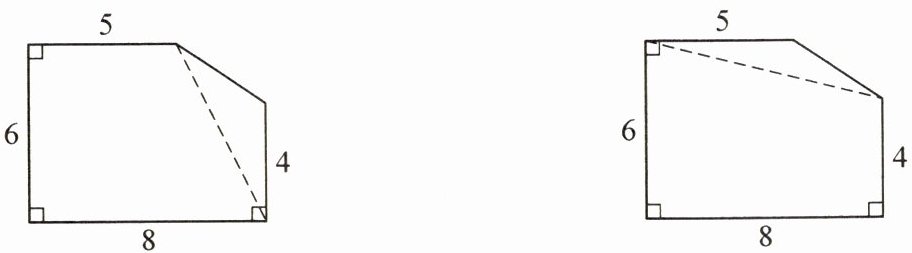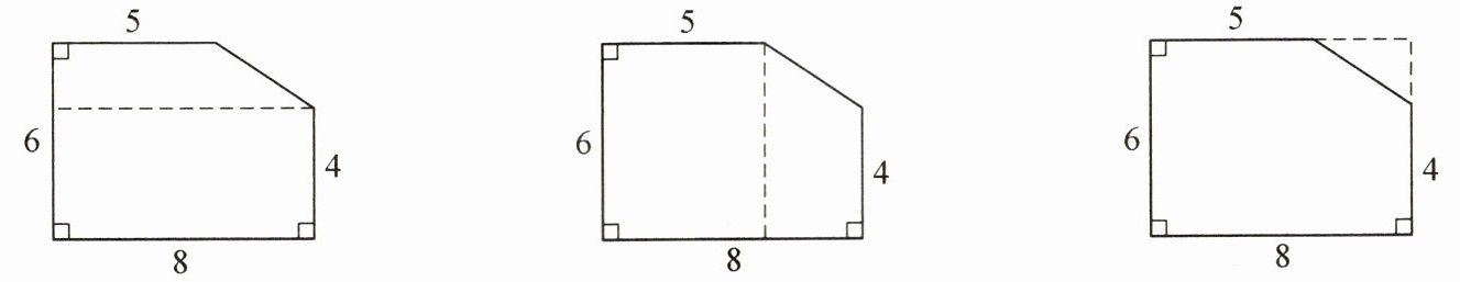 2(5+8)×(6−4)÷2+8×4=45cm² (4+6)×(8−5)÷2+5×6=45cm² 6×8−(8−5)×(6−4)÷2=45cm² (5+8)×6÷2+4×(8−5)÷2=45cm² (6+4)×8÷2+5×(6−4)÷2=45cm²
