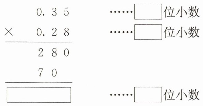 $\begin{array}{r} 0.35\\ ×\quad 0.28\\ \hline 280\\ 70\quad \\ \hline \quad \end{array}\quad \\ \hline \quad $