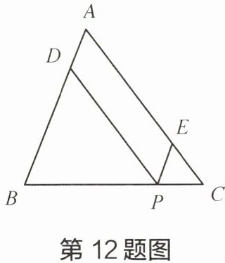 12 如图,在$\triangle ABC$中,点$P在边BC$上,四边形$ADPE$是平行四边形,若$AB = 14$,$AD = 2$,$CE = 3$,求$AC$的长。