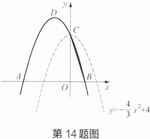 14 如图,将抛物线$y = - \frac{4}{3}x^{2} + 4$平移后,新抛物线经过原抛物线的顶点$C$,新抛物线与$x轴正半轴交于点B$,联结$BC$,$\tan \angle CBO = 4$,设新抛物线与$x轴的另一交点是A$,新抛物线的顶点是$D$,求点$D$的坐标。