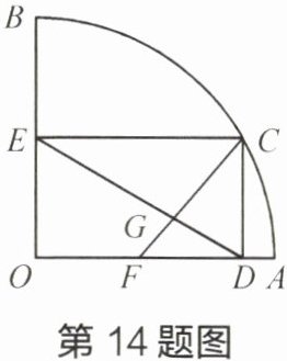 14 如图,扇形$OAB的半径OA= 3$,$\angle AOB= 90^{\circ}$,点$C是\overset{\frown}{AB}上异于A$、$B$的动点,过点$C作CD\perp OA于点D$,作$CE\perp OB于点E$,联结$DE$,点$F是OD$的中点,联结$CF$,交$ED于点G$,当点$C在\overset{\frown}{AB}$上运动时,在线段$DC$、$DG$、$DF$中,是否存在长度不变的线段?若存在,请求出该线段的长度;若不存在,请说明理由。