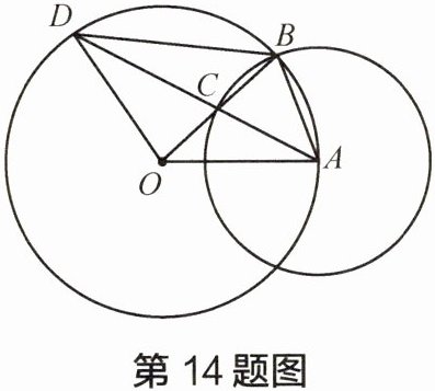 14 如图,已知 $ \odot O $ 的半径 $ OA $ 的长为 2,点 $ B $ 是 $ \odot O $ 上的动点,以 $ AB $ 为半径的 $ \odot A $ 与线段 $ OB $ 相交于点 $ C $, $ AC $ 的延长线与 $ \odot O $ 相交于点 $ D $。设线段 $ AB $ 的长为 $ x $,线段 $ OC $ 的长为 $ y $。